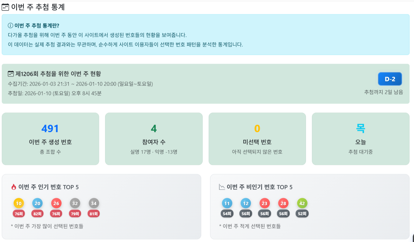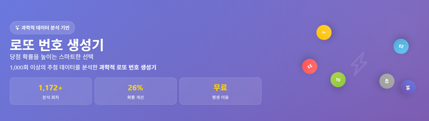 간편함 + 무료 + 통계 기반 추천까지 부담 없이 사용하기 좋은 로또 번호 생성 서비스입니다.