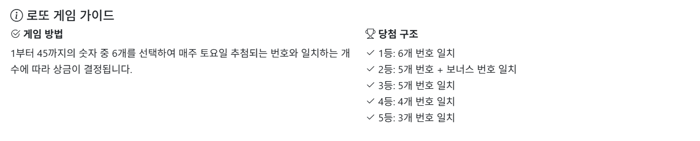 로또 게임 방법, 당첨 구조, 당첨금 수령 방식 등 로또 초보자도 이해하기 쉬운 기본 정보가 함께 정리되어 있습니다.