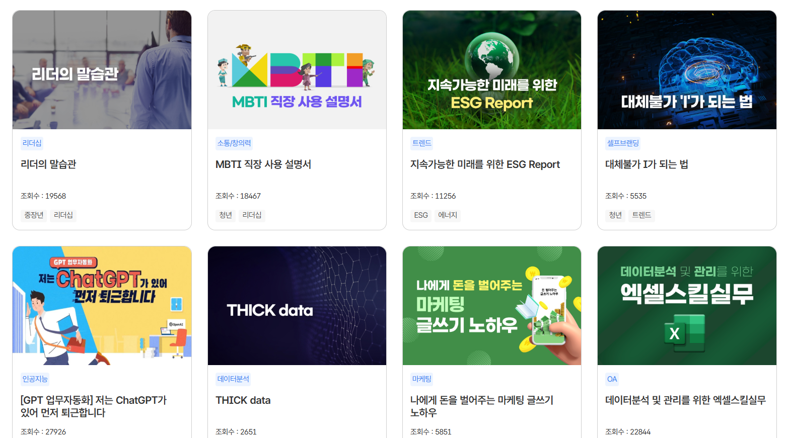 기초 학습부터 직무 역량 강화, 인문 교양, 중장년 맞춤 교육까지 다양한 목적에 맞춰 활용할 수 있는 콘텐츠가 준비되어 있습니다.
